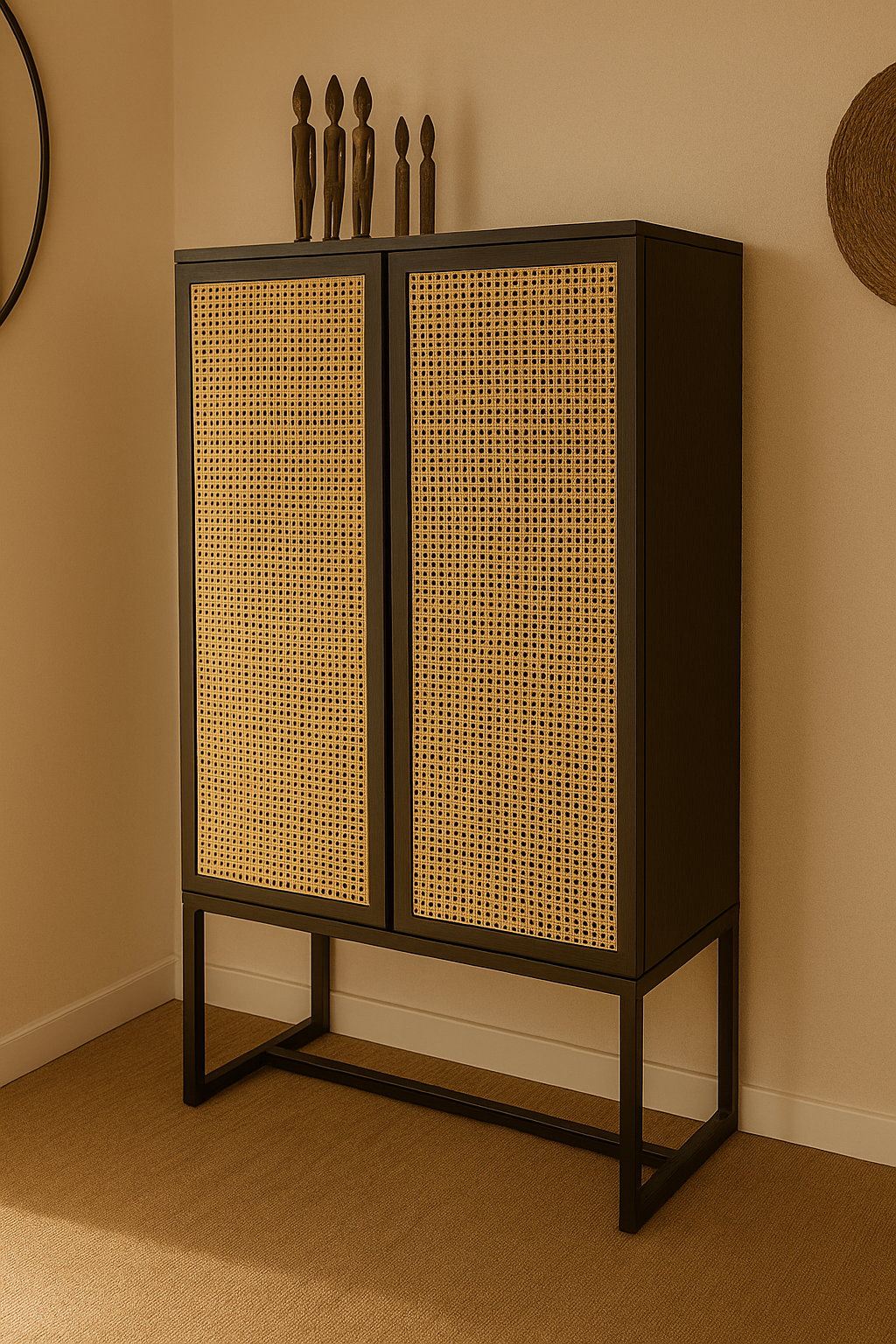 Een leuke barkast gemaakt uit gecertificeerd teakhout met prachtige webbing deurtjes.